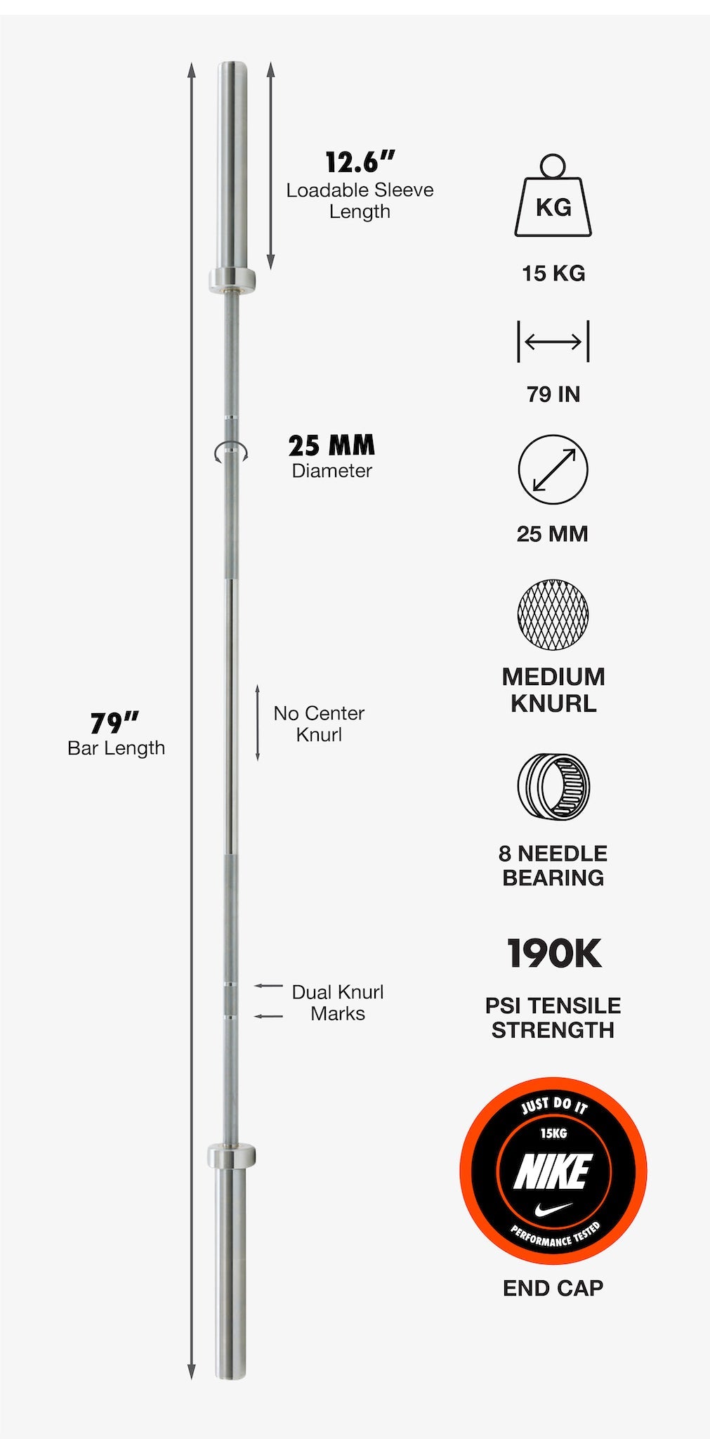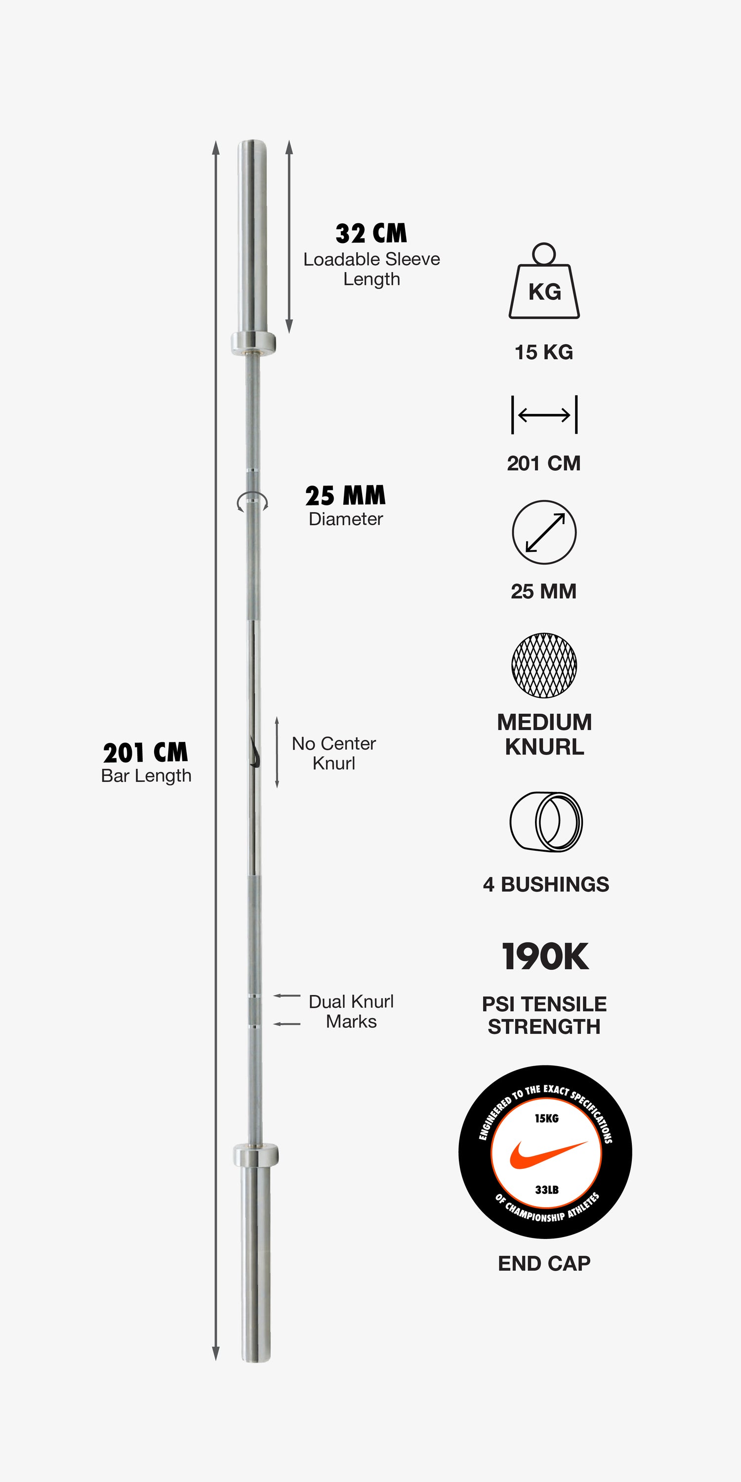 - Bar Weight: 15 kg (33 lb)