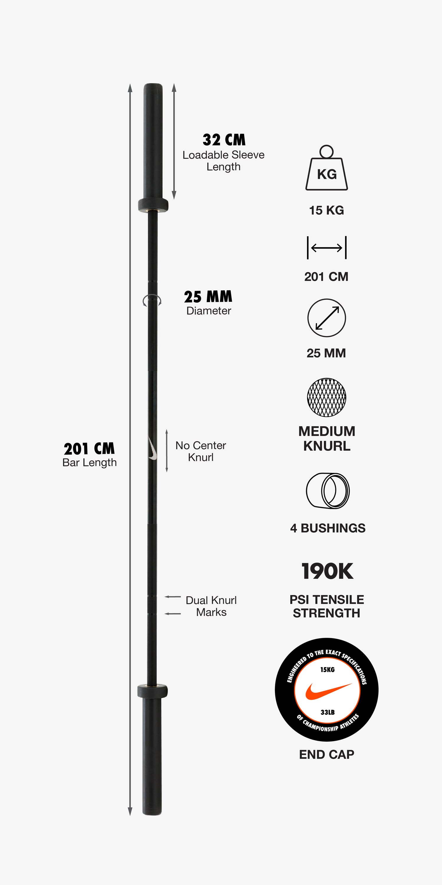 Elevate your strength game with the Nike Barbell – your all-in-one solution for HIIT, Olympic lifts, and functional training. With a 25mm shaft and a robust chrome finish, this barbell will stand the test of time. A medium volcano knurl with dual knurl marks and no center knurl make this barbell perfect for all occasions. Smooth rotation for all lifts supported by 4 premium bushings. Unleash your full potential with the Nike Barbell – where durability meets precision. JUST DO IT.